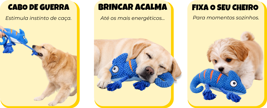 Material macio e confortável, com efeitos sonoros que estimulam a mordida. A textura em relevo retém o cheirinho do tutor, trazendo conforto na brincadeira.
