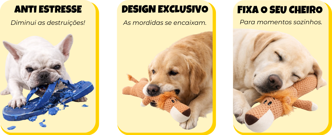 Material macio e confortável, com efeitos sonoros que estimulam a mordida. A textura em relevo retém o cheirinho do tutor, trazendo conforto na brincadeira.