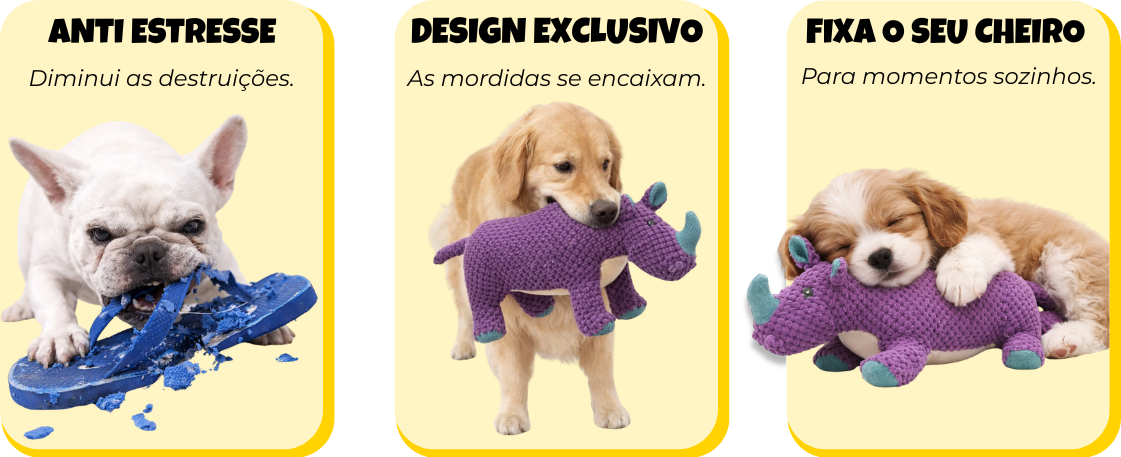 Material macio e confortável, com efeitos sonoros que estimulam a mordida. A textura em relevo retém o cheirinho do tutor, trazendo conforto na brincadeira.