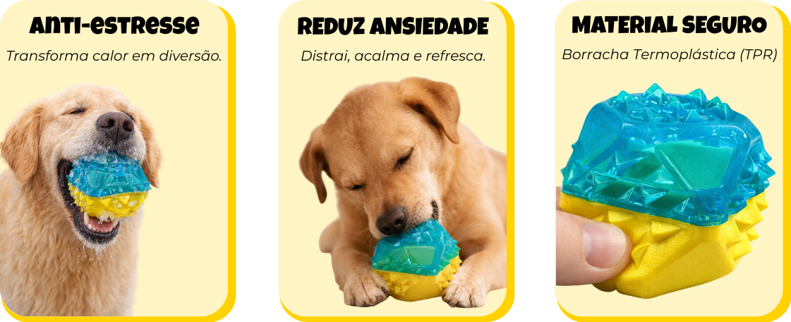Sistema Interativo: Coloque o mordedor em um recipiente com água e pressione-o para que absorva o líquido em seu interior. Em seguida, leve-o ao freezer até que a água esteja completamente congelada.