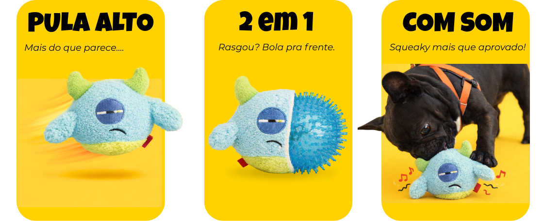 Brinquedo da Coleção Monstrinhos com bolinha interna integrada ao corpo, responsável pelo som squeaky ao receber mordidas e pelo pulo ao ser arremessado, estimulando brincadeiras interativas.