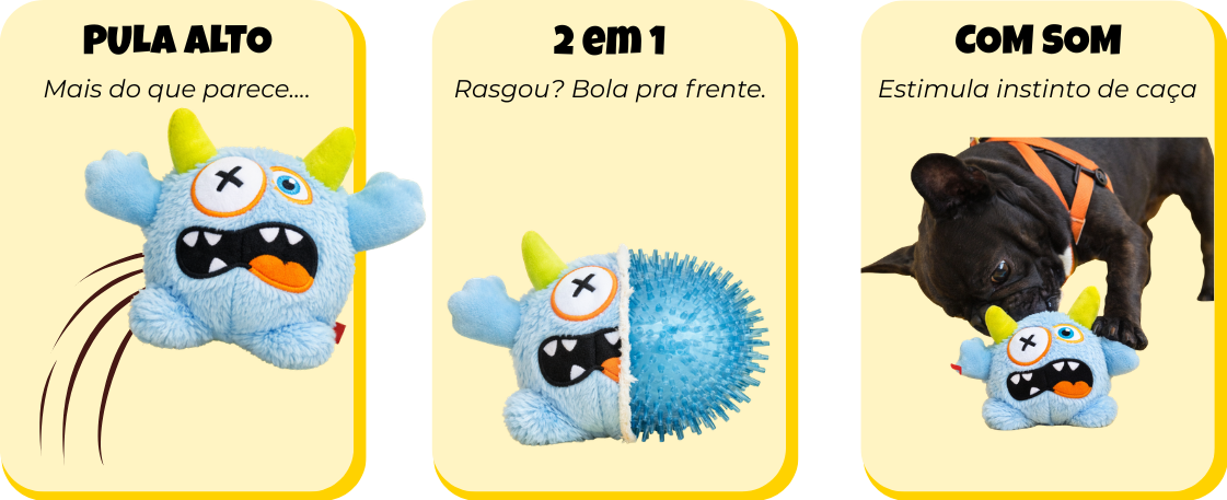Brinquedo da Coleção Monstrinhos com bolinha interna integrada ao corpo, responsável pelo som squeaky ao ser apertado e pelo pulo ao ser arremessado, incentivando brincadeiras ativas e interativas.