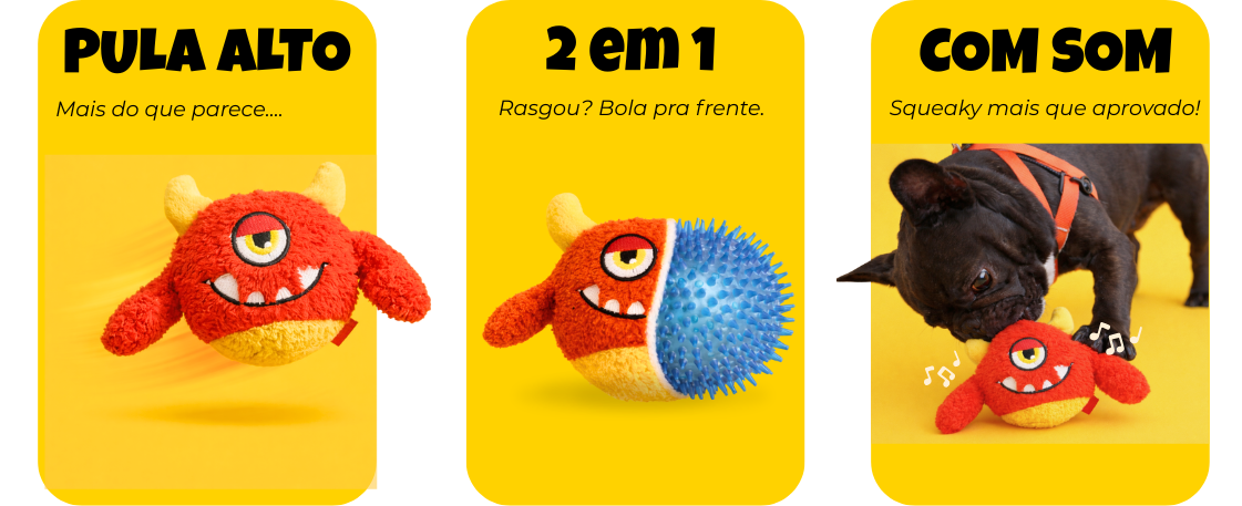 Brinquedo da Coleção Monstrinhos com bolinha interna integrada ao corpo, responsável pelo som squeaky ao receber mordidas e pelo pulo ao ser arremessado, estimulando brincadeiras mais interativas.