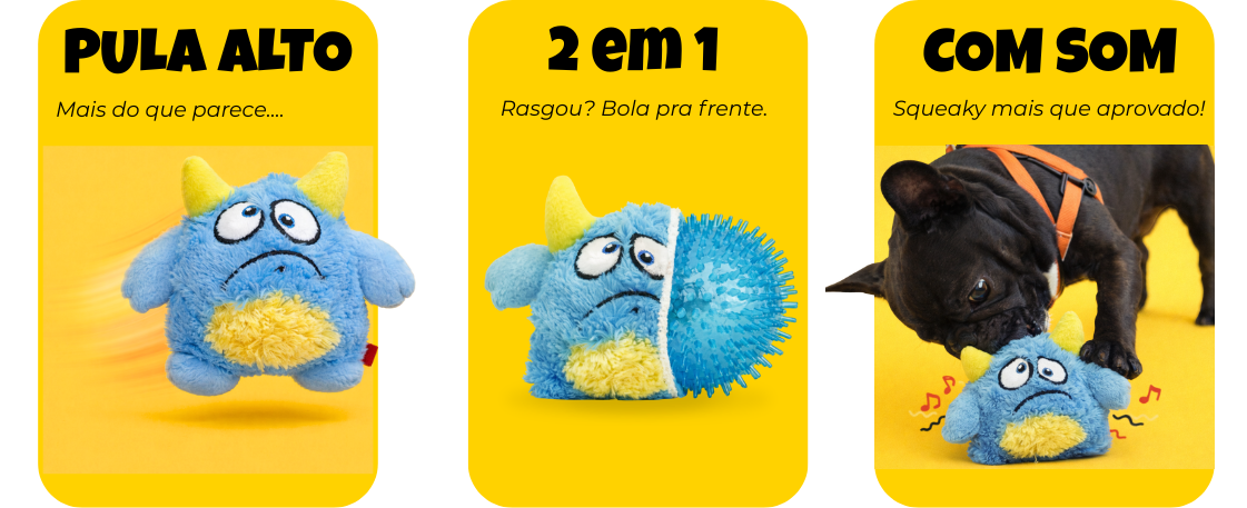 Brinquedo da Coleção Monstrinhos com bolinha interna integrada ao corpo, responsável pelo som squeaky ao receber mordidas e pelo pulo ao ser arremessado, estimulando brincadeiras interativas