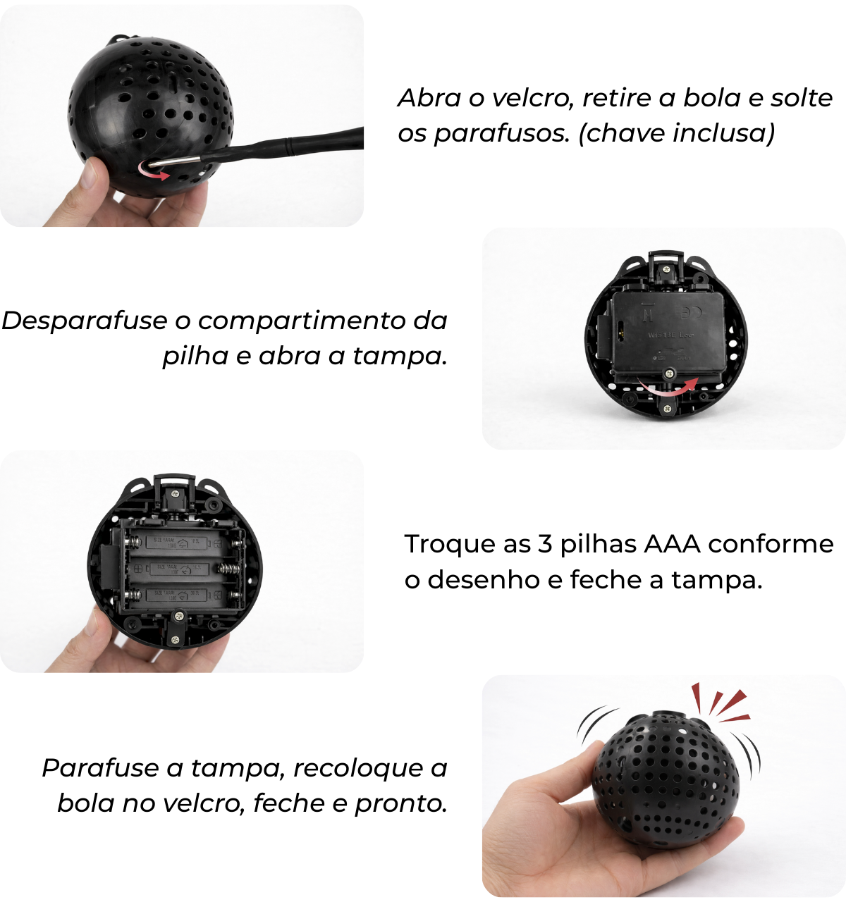 •Alimentação e Acessórios: 3 pilhas AAA inclusas + manual de instruções + chave para abertura dos parafusos