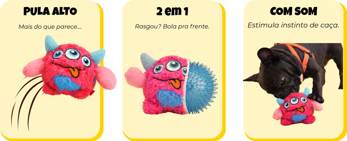 Brinquedo da Coleção Monstrinhos com bolinha interna integrada ao corpo, responsável pelo som squeaky ao receber mordidas e pelo pulo ao ser arremessado, estimulando brincadeiras interativas.