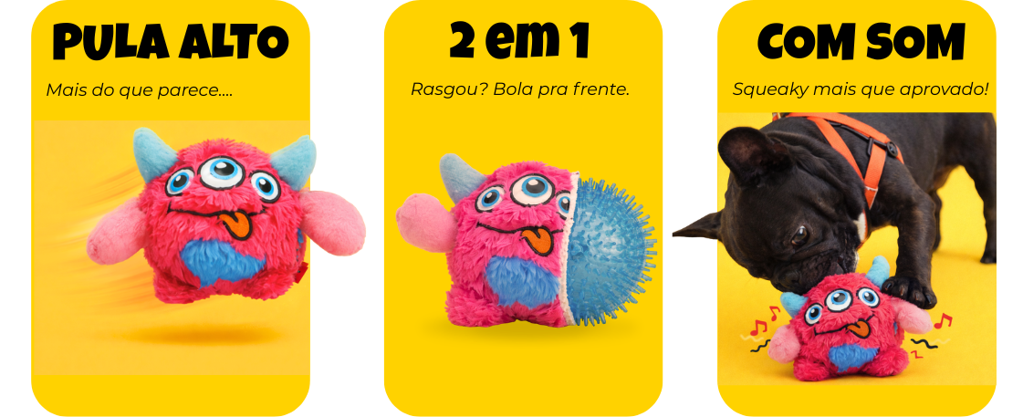 Brinquedo da Coleção Monstrinhos com bolinha interna integrada ao corpo, responsável pelo som squeaky ao receber mordidas e pelo pulo ao ser arremessado, estimulando brincadeiras interativas.