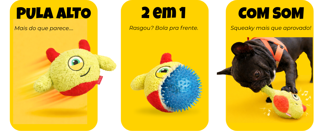Brinquedo da Coleção Monstrinhos com bolinha interna integrada ao corpo, responsável pelo som squeaky ao receber mordidas e pelo pulo ao ser arremessado, estimulando brincadeiras interativas.