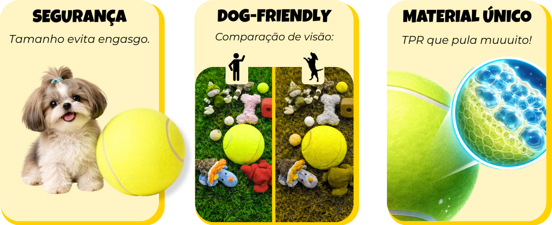 Tamanho ideal, alta resistência e pulo que mantém a brincadeira sempre ativa. Sua cor facilita a visualização para o pet, deixando tudo mais envolvente e natural.