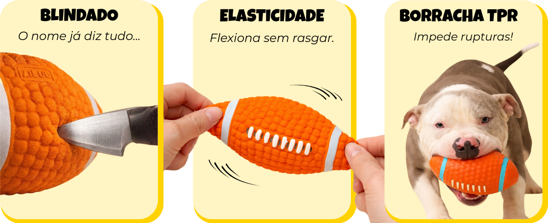 Desenvolvido em formato de bola esportiva, com textura macia e resistente, permite compressão na mordida e emite som ao ser pressionado, tornando a brincadeira mais estimulante e interativa.